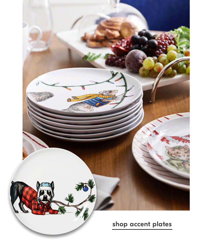 Add holiday cheer even at breakfast with charming Dapper Animal plates and red-striped plates + bowls.