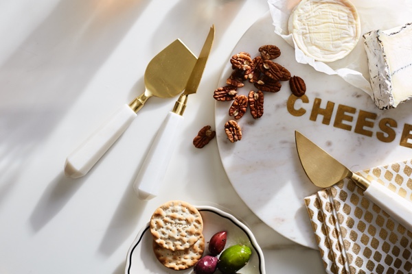 Distribute your apps on trays + boards throughout your living space and kitchen so that traffic doesn't jam into one area and guests are encouraged to mix + mingle. Our Marble + Wood Cutting Boards can look equally modern or traditional to suit your style.