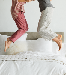 Create a canvas with a crisp white organic sheet set—you can never have too many. Add color with an upholstered headboard, patterned pillows or a colorful duvet + sham set. Switch up your layers seasonally (think textured jacquards, flannel or European Flax Linen) to keep your look fresh.