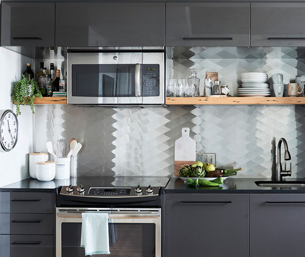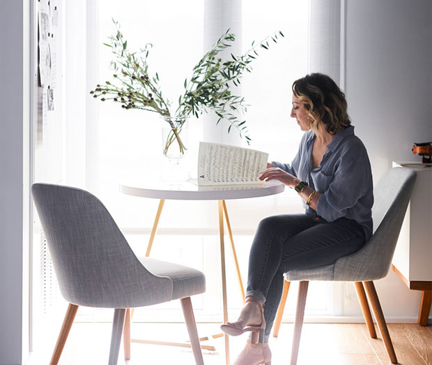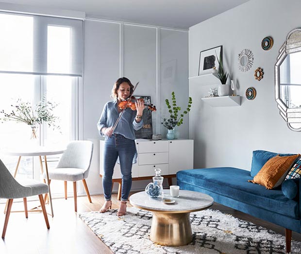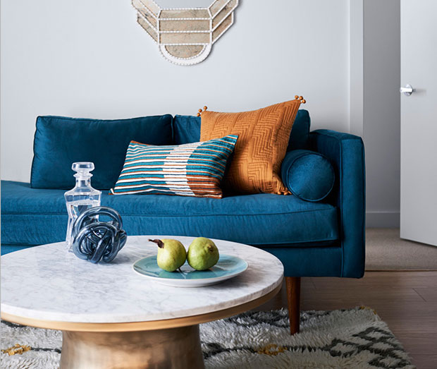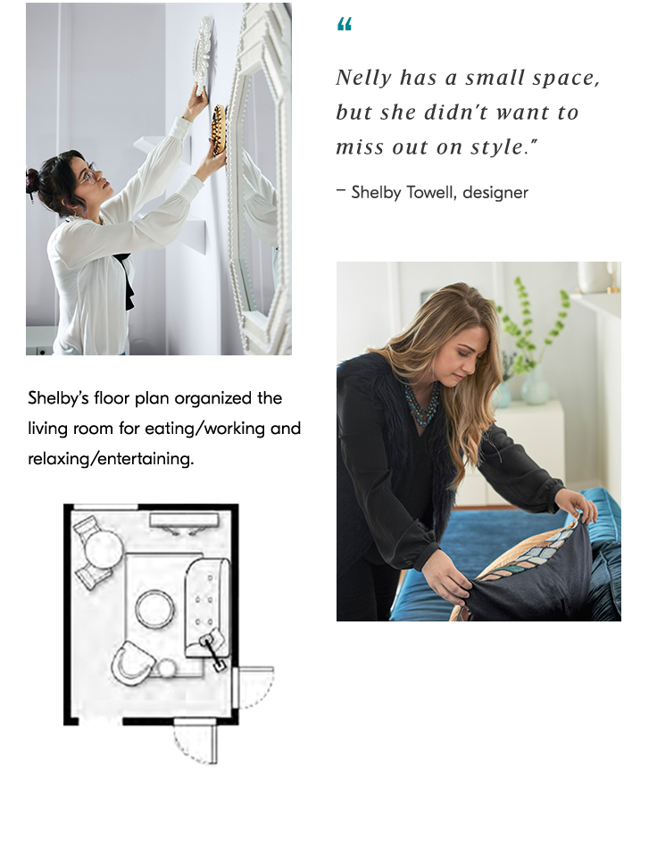 Zoning is key. Rounded pieces were added for easy navigating in compact quarters as well as a gallery wall of mirrors to enlarge the space + reflect light.
