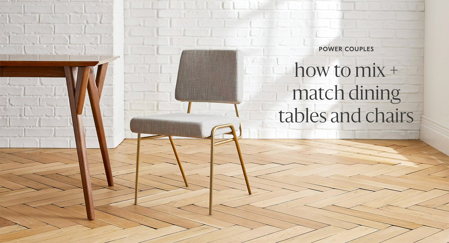 It’s easier to mix two different materials, such as an upholstered chair with a wood table, than it is to mix two different wood or metal finishes.