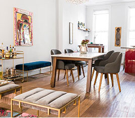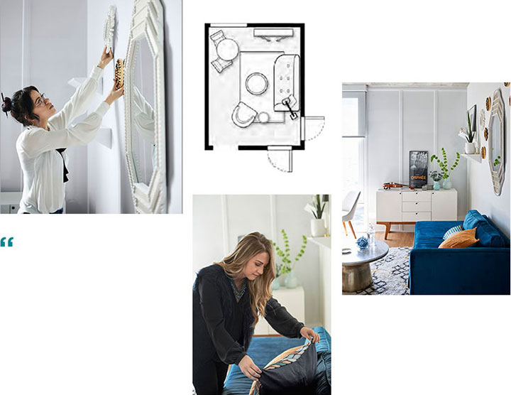Zoning is key. Rounded pieces were added for easy navigating in compact quarters as well as a gallery wall of mirrors to enlarge the space + reflect light.