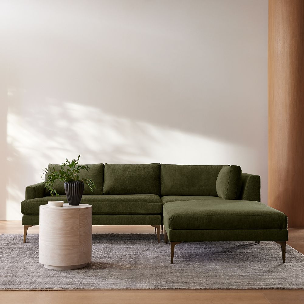 With its modern form, extra-deep seat and crisp tailoring, our spacious Andes Sectional has serious presence but feels airy and light thanks to the thin frame and cast metal legs. Its durable frame comes in your choice of width, depth and leg finish.