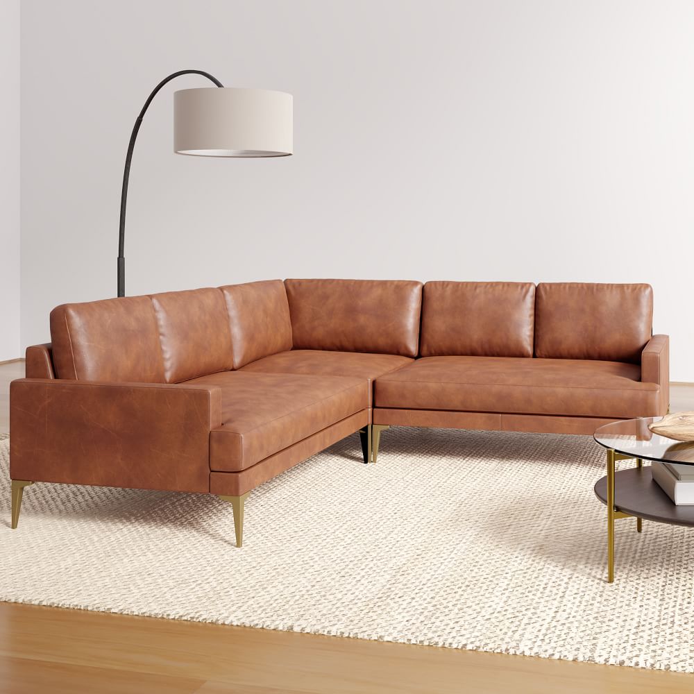 With its modern form, deep seat and crisp tailoring, our spacious Andes Leather Sectional has serious presence (it seats up to eight) but feels airy and light thanks to thin arms and cast metal legs. Its reinforced frame is Contract Grade, making it durable enough for even commercial settings.