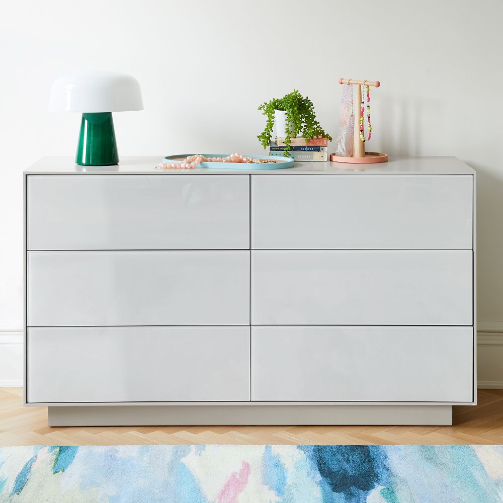 Striking in its simplicity, our Emilia Dresser's clean-lined shape is enhanced by a glossy lacquer finish, a back-painted glass facade and soft-close drawers that are finished on the inside too.