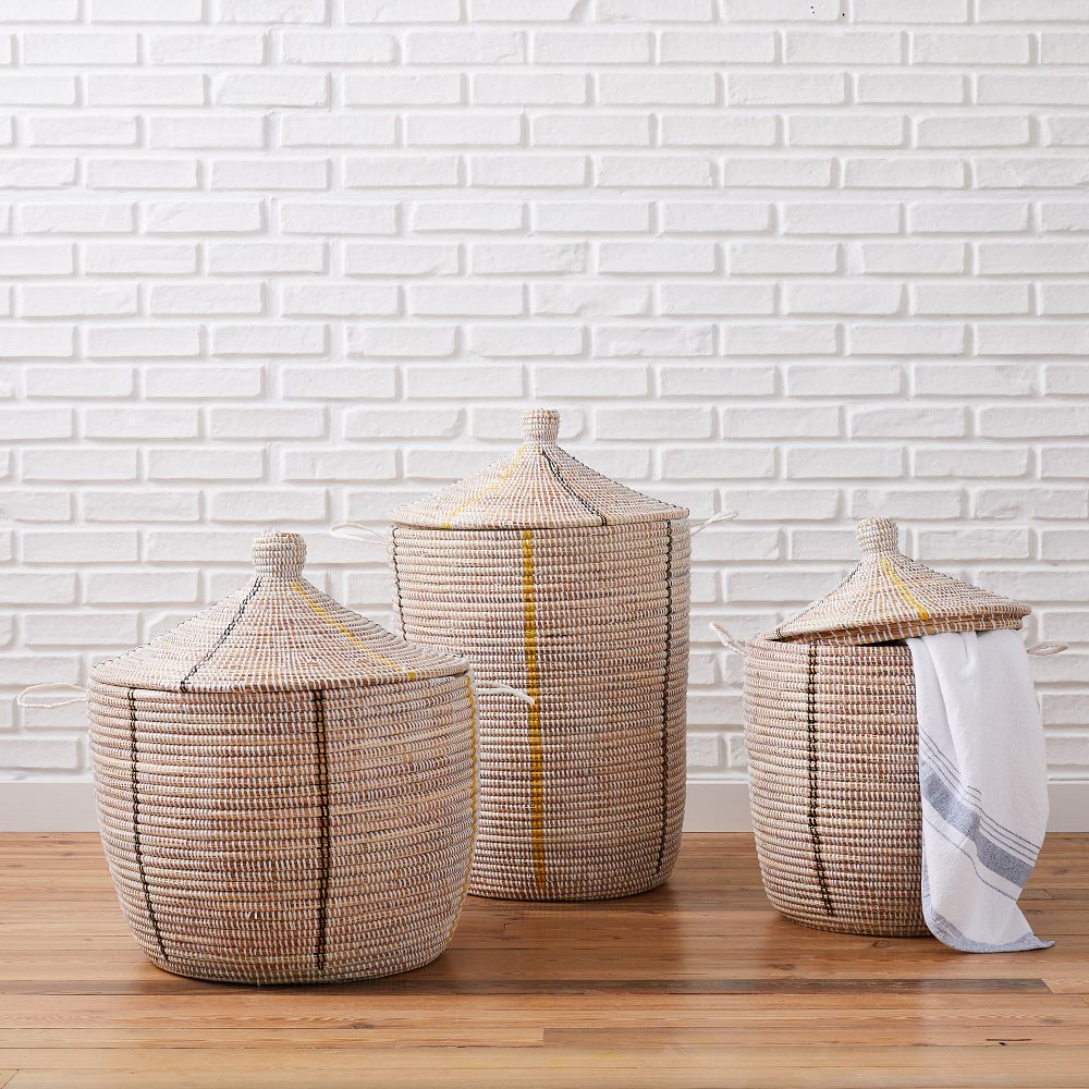 Craftswomen in rural Senegal use traditional techniques to handweave these Graphic Woven Baskets from millet grass and recycled plastic threads. Use them for laundry, towels, toys or as entryway catchalls.