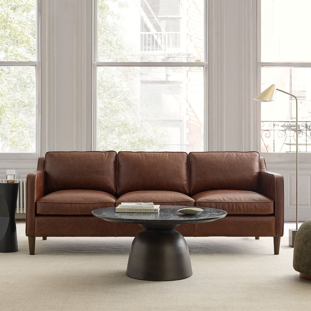 Inspired by 1950s furniture silhouettes, our Hamilton Sofa feels as luxurious as it looks: down-wrapped back cushions offer sink-right-in comfort and it comes covered in your choice of leather. Though intended for your living room, the kiln-dried, Contract Grade frame is durable enough for even commercial settings.