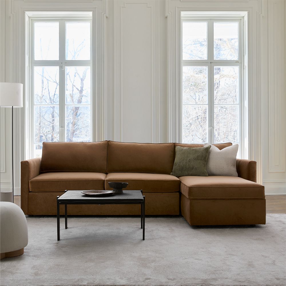 Featuring clean lines and tailored details, our Harris Collection's go-with-anything design is an instant crowd-pleaser. This sleeper sectional has a Queen-sized, pull-out mattress and storage chaise, both of which come in handy when company calls. Each is assembled in the USA in your choice of fabric (including our family-friendly performance fabrics), so you can create the perfect piece for your home.
