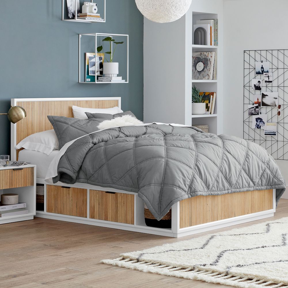 Brought to you in collaboration with Pottery Barn Teen, the Quinn Storage Bed combines contemporary style with durable craftsmanship. Its sizable frame has a grooved wood headboard and is covered in water-based finishes. Store clothes, bedding and more in the pull out drawers and open cubbies.