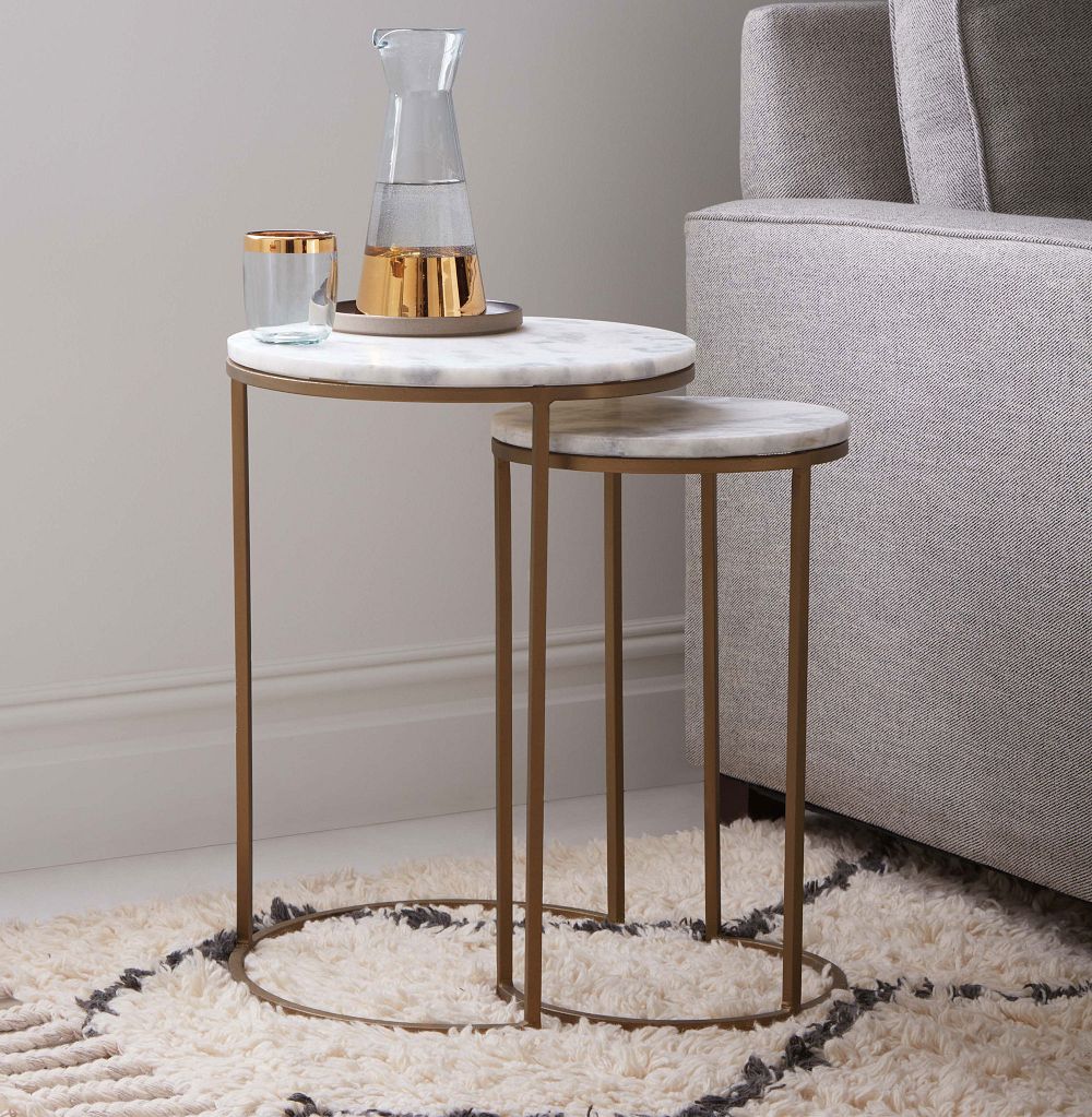 For a touch of Art Deco glam, we finished the sculptural metal bases of our Round Nesting Tables with smooth marble tabletops. Scaled for smaller spaces, its nesting function lets you hide the smaller table under the larger one, and pull it out when you need more surface space.
