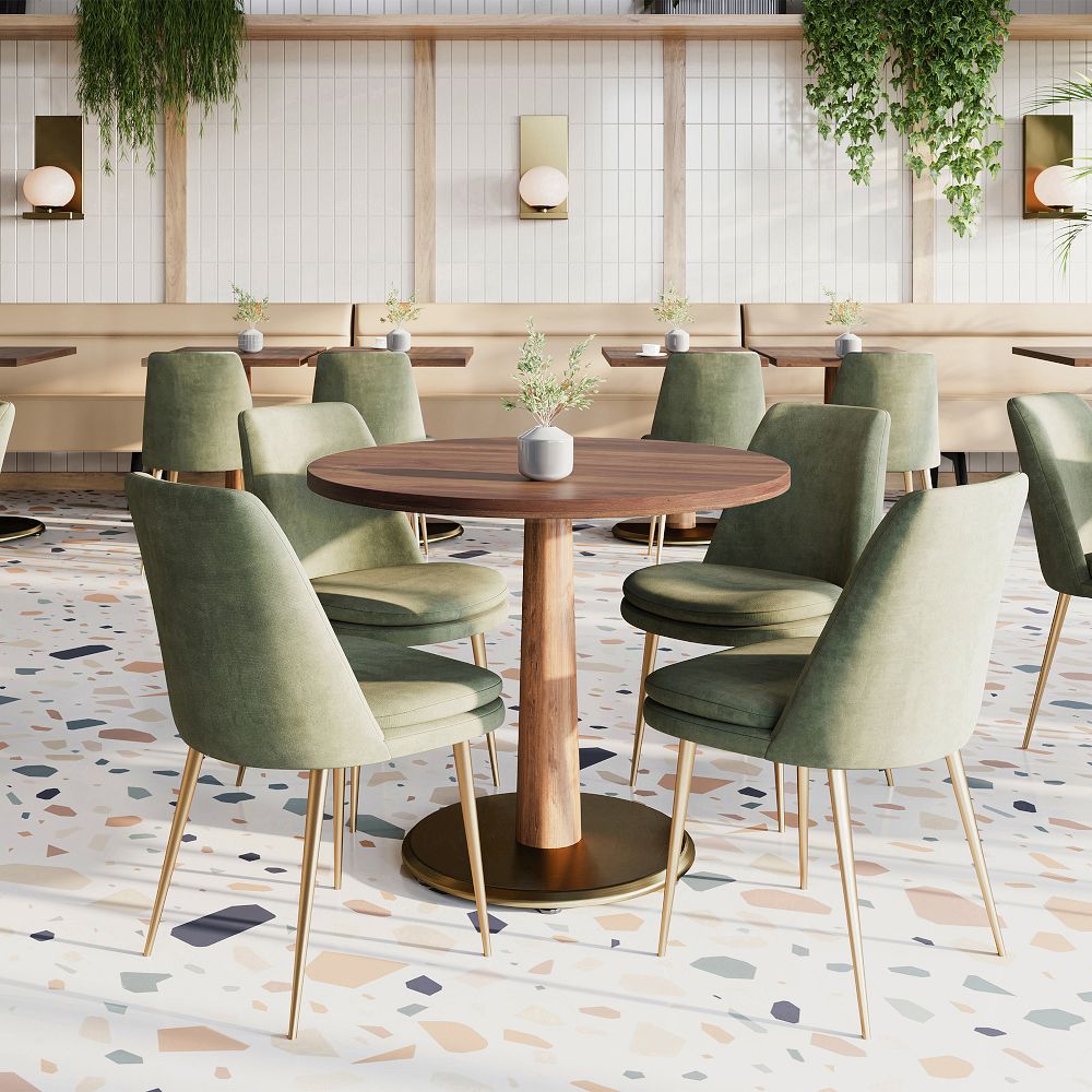 | Walnut Restaurant Dining Table, 36" Round, Claire Base, Blackened Brass, Walnut on Beech |