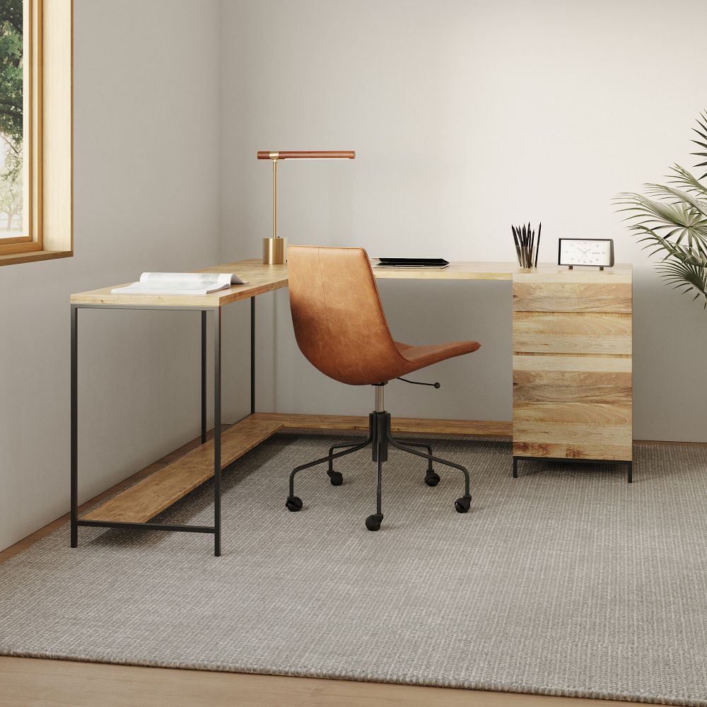 Made from richly-grained solid mango wood and lofted on blackened metal legs, our Industrial Modular Desk features two separate work surfaces and a bottom shelf to prop your feet up on. The attached box file keeps papers and supplies organized and out of the way.